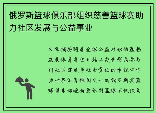 文章摘要:随着全球公益活动的蓬勃发展,体育界也开始以更多形式参与到社区建设与社会责任的承担中。作为世界体育强国之一的俄罗斯,其篮球俱乐部逐渐意识到,篮球不仅仅是竞技体育,它更是连接人心、促进社会发展的强大力量。俄罗斯的篮球俱乐部通过组织慈善篮球赛,不仅能够为社区带来经济收益,还能激发社会成员参与公益事业的热情,从而助力社区的可持续发展。本文将从四个方面详细探讨俄罗斯篮球俱乐部通过组织慈善篮球赛,如何为社区发展和公益事业贡献力量。第一部分将分析慈善篮球赛的组织模式与特点,第二部分探讨慈善赛如何促进社区经济与社会融合,第三部分讨论其在提升公众意识和参与度方面的作用,第四部分将分析此类活动对俱乐部和社会关系的深远影响。通过全面的分析,本文期望为俄罗斯乃至全球其他地区的公益活动提供一些有益的经验和启示。